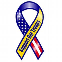 100 The words Support Our Troops is written on this Yellow interior static cling ribbon. Perfect for vehicles, construction equipment or anywhere interior static cling will adhere. Measures 8″ Long x 3.875″ Wide.
