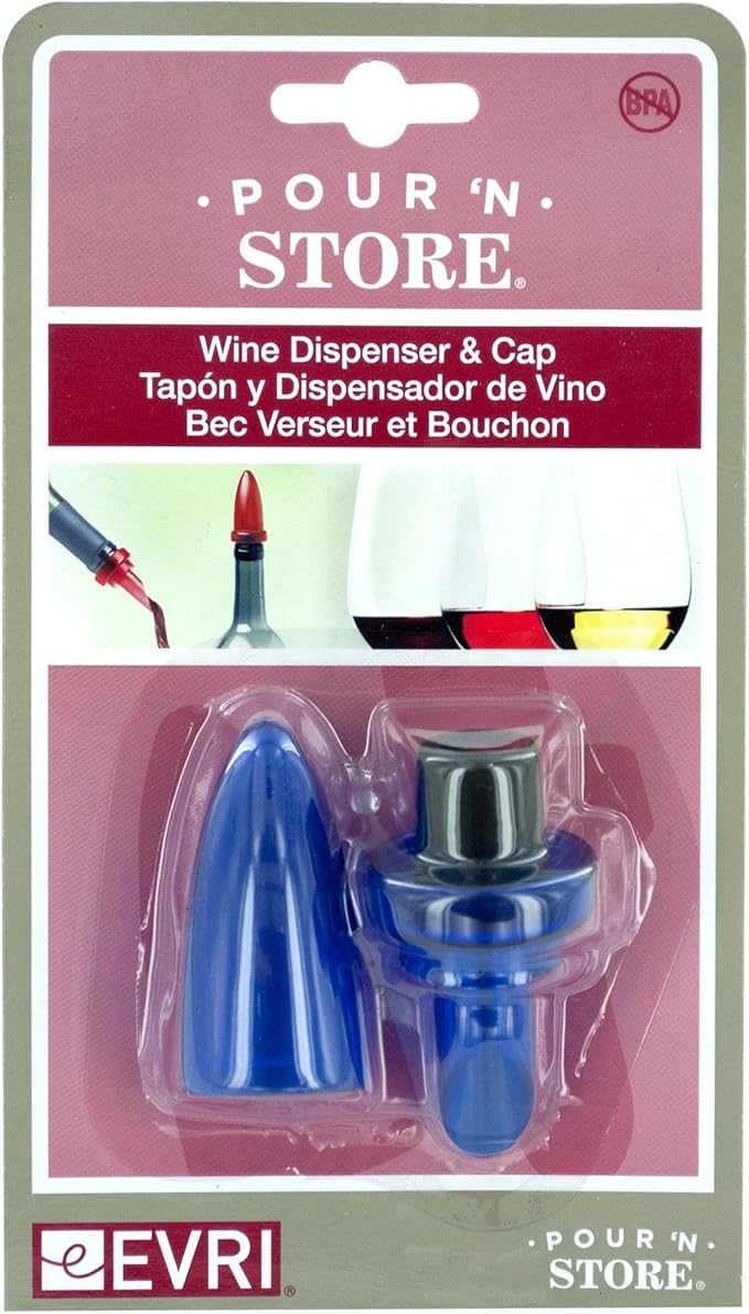 Easily pour and seal wine bottles with this Pour 'N Store Wine Dispenser & Cap Set featuring a pour spout and storage cap made of durable plastic. Comes in assorted colors. BPA free. Care and use instructions included. Comes in assorted colors (Red, Blue & Clear) . Comes packaged in a blister pack.